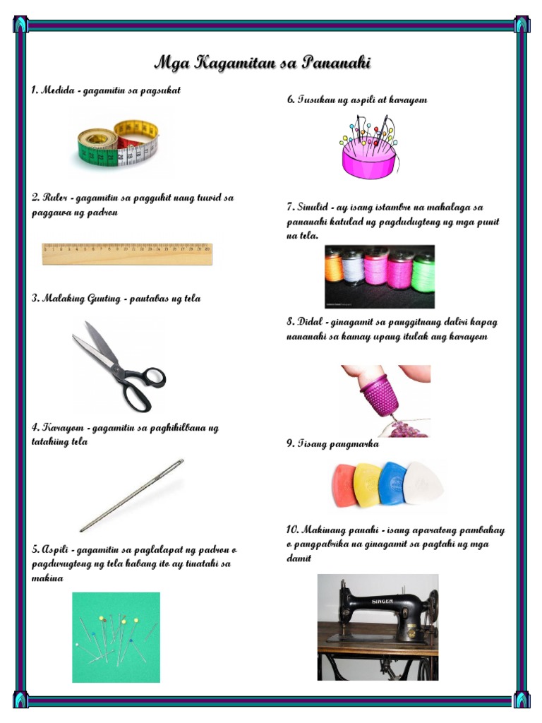 Mga gamit sa pananahi tagalog. MyMemory Worlds Largest Translation Memory. Teacher I ginagamit itong pangwalis sa sahig na makinis. Ang pananahi ay isang gawain o hanap-buhay kung saan pinagdurugtong ng isang dalubhasang mananahi ang mga tela o katad upang makabuo ng isang damit sapatos o anumang bagay na maisusuot o may iba pang paggagamitan.