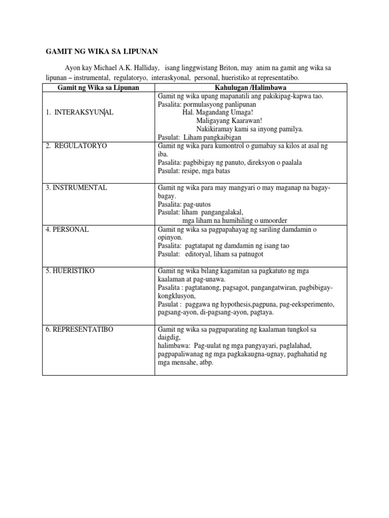 View GAMIT NG WIKA SA LIPUNANpdf from FILIPINO 1426 at Philippine Normal University. Halliday isang linggwistang Briton may anim na gamit ang wika sa lipunan instrumental regulatoryo interaskyonal personal hueristiko at representatibo. Durkheim 1985 Nabubuo ang lipunan ng mga taong naninirahan sa isang pook.
