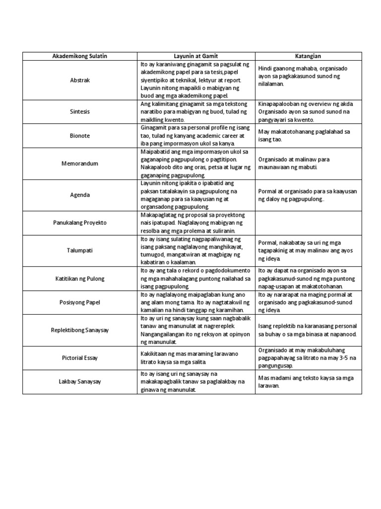 13 rows Akademikong Sulatin Layunin at Gamit Katangian ABSTRAK. Hindi gaanong mahaba organisado ayon sa pagkakasunod sunod ng nilalaman. Kalahatang ideya ng nilalaman.